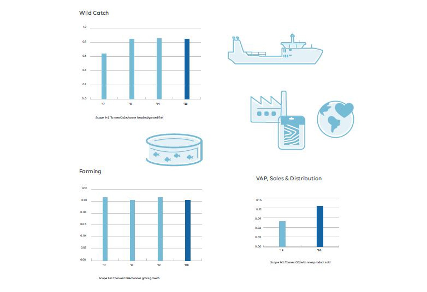 Lerøy has set ambitious science based targets to reduce our environmental footprint: We aim to reduce our Co2e emissions by 46% by 2030 compared to 2019 levels. (ref: Climate Policy). Lerøy has defined 2019 as the base year for our science-based climate target as this was the first year all operating segments in the Group were included in the emission reporting. The Group’s operating segments comprise the following: 1) Wild Catch 2 ) Farming and 3) Value Added Processing which also includes sales and distribution.