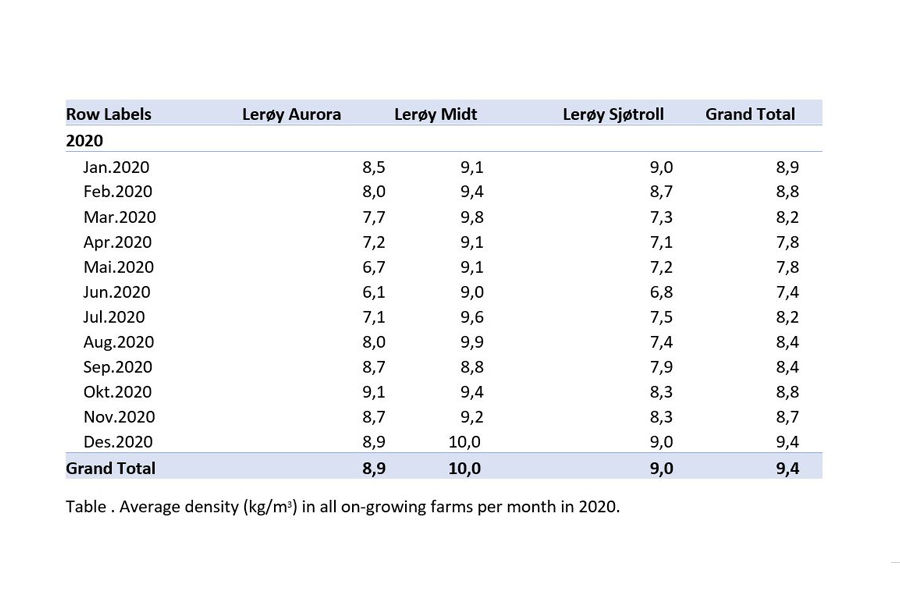 The maximum legislative limit for fish density in a cage is 25 kg/m3 but the results for 2019 were far below this limit, indicating that the fish have plenty of space in the cages.