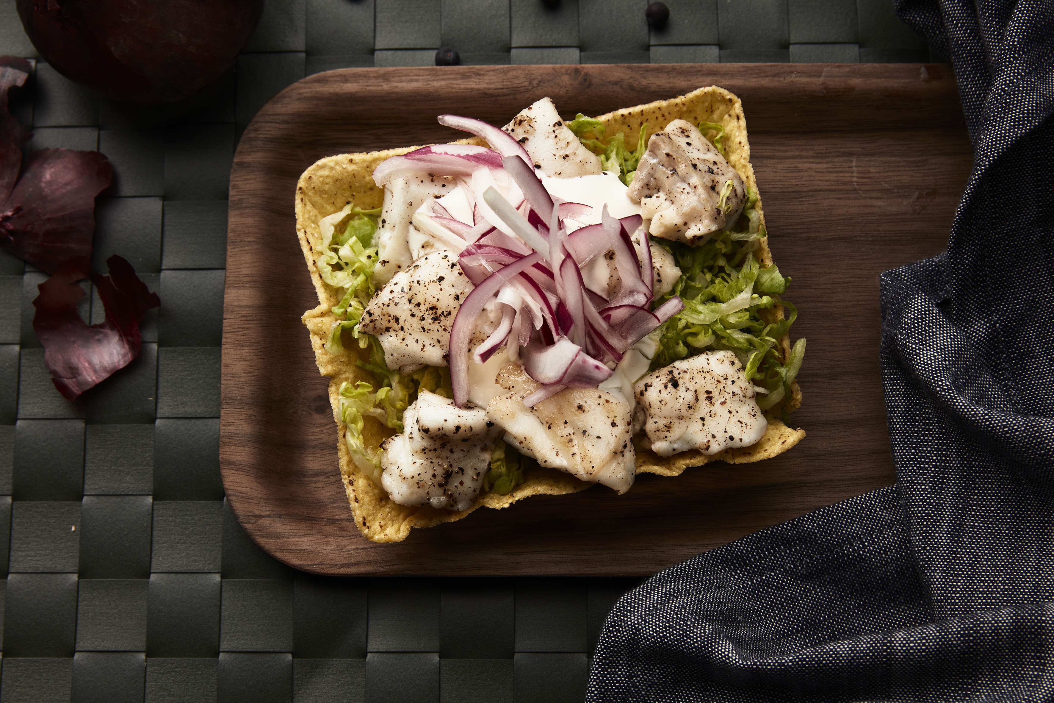 Fisketaco med syltet rødløk og rømme
